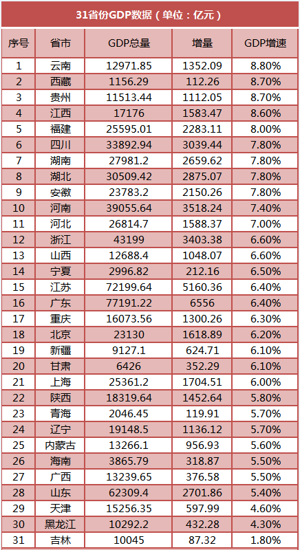 2019年前三季度,中國國內(nèi)生產(chǎn)總值697798億元,按可比價格計算,同比增長6.2%。同全國水平相比,云南、貴州、西藏、江西、福建、四川、湖北、湖南、安徽、河南、河北、浙江、山西、寧夏、廣東、江蘇、重慶這17省份前三季度GDP增速跑贏全國。