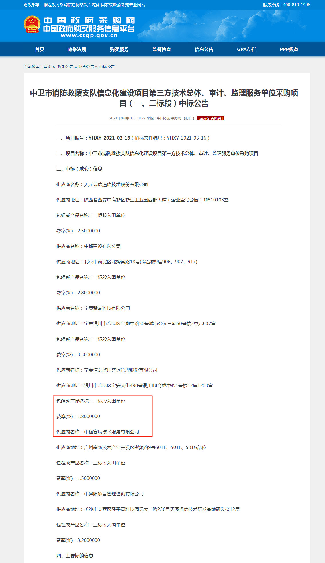 奮力開創!祝賀中檢賽辰技術服務有限公司(簡稱:賽辰)中標中衛市消防救援支隊信息化建設項目第三方技術總體、審計、監理服務單位采購項目(三標段入圍單位)。